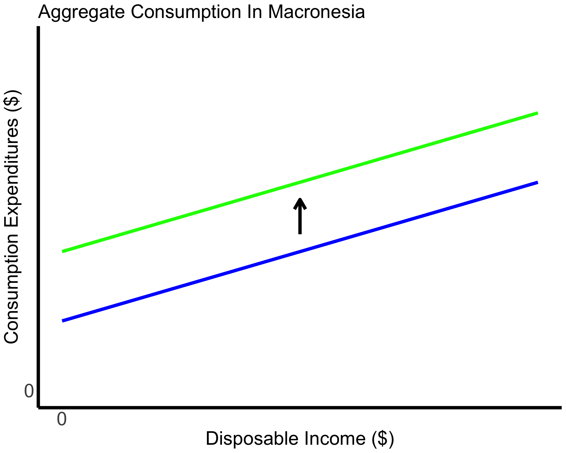 Investment spending will raise GDP and Macronesians’ expectations for future disposable income. This should increase aggregate consumption expenditures (which will shift the curve on the graph upward).
