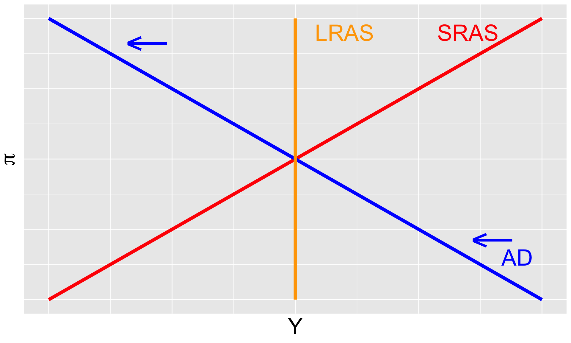 Decreasing government expenditures on goods and services (\(\downarrow\) \(G\) in the GDP equation)